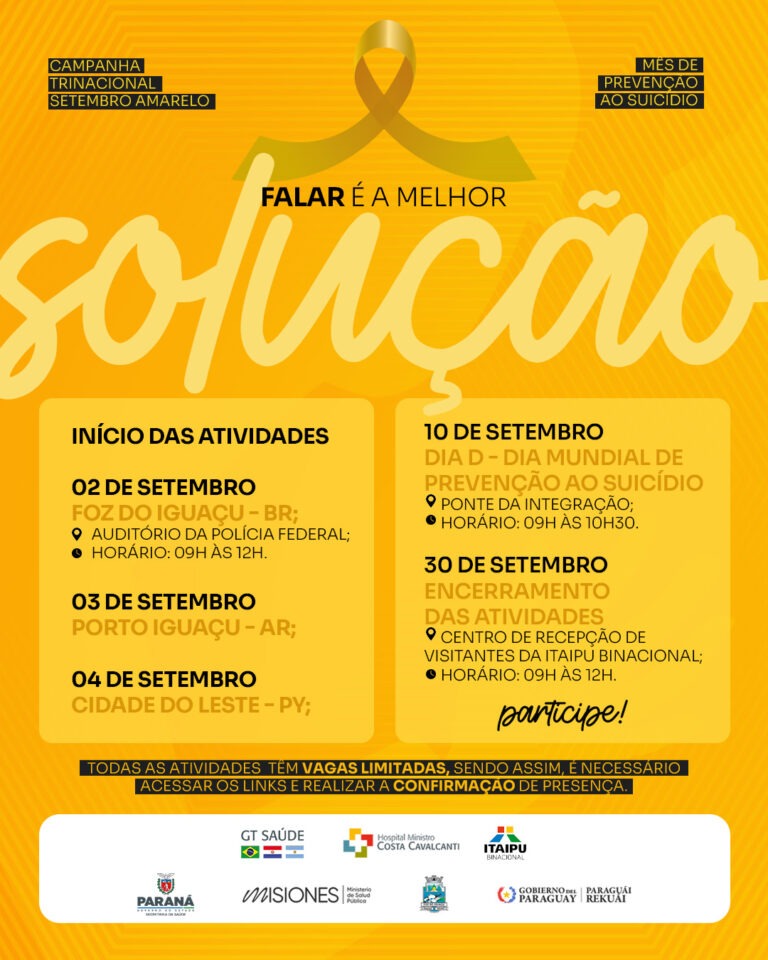Neste ano, estão previstas diversas rodas de conversa em escolas do Brasil, Paraguai e Argentina, além de instituições militares iguaçuenses. Também está previsto um evento no “Dia D”, no Marco das Três Fronteiras, e a implantação e distribuição do Protocolo Trinacional de Orientações para Acolhimento a Pessoa com Pensamento Suicida.