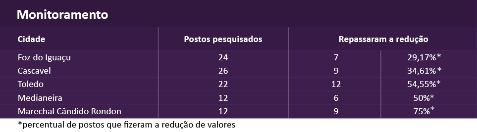 Entre as cidades pesquisadas, Foz do Iguaçu foi a que apresentou o menor índice de postos com redução de preços: apenas 29,17%. Marechal Cândido Rondon teve o melhor resultado do ponto de vista do consumidor: 75% dos postos monitorados reduziram os valores da gasolina.