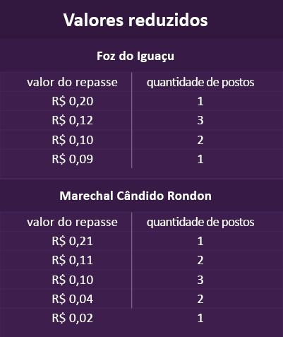 O grupo monitorou, entre 1º e 21 de junho, 96 postos de combustíveis em cinco municípios: Foz do Iguaçu, Cascavel, Toledo, Medianeira e Marechal Cândido Rondon (veja tabela). Nesse período, a Petrobras reduziu em R$ 0,17 o preço do litro da gasolina. Essa redução foi implementada no dia 3 de junho.
