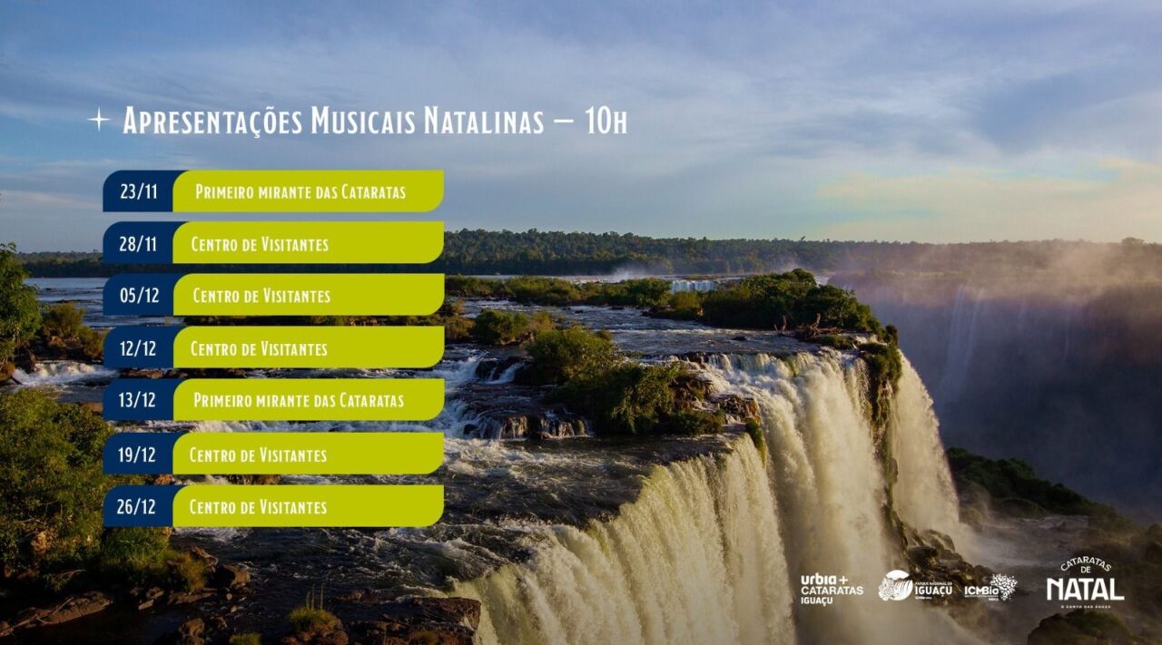 De 23 de novembro a 26 de dezembro, quem visitar as Cataratas do Iguaçu, Maravilha Mundial da Natureza, poderá vivenciar momentos únicos, com apresentações musicais, ambientações temáticas e o espetáculo inédito “Cataratas de Natal — O Canto das Águas”, que marca o ponto alto da programação, com a primeira orquestra à base de água do mundo.