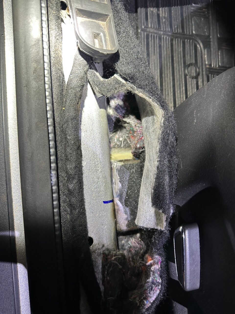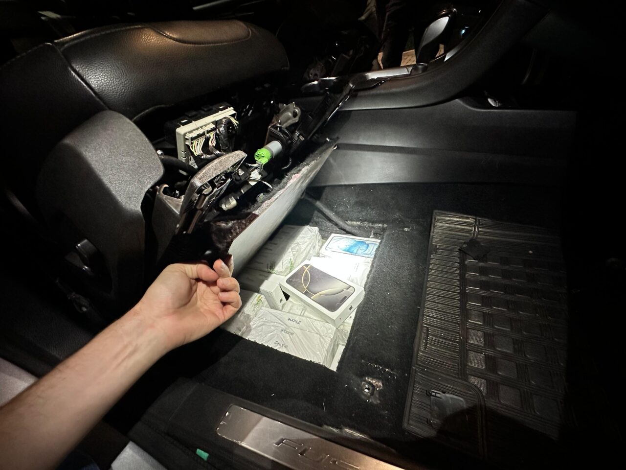 O veículo suspeito trafegava pela PR-585, nas proximidades de Toledo – PR, quando foi abordado por equipes da Polícia Militar. Durante a vistoria, os agentes identificaram indícios de um fundo falso no assoalho, logo abaixo dos bancos do motorista e do passageiro.
