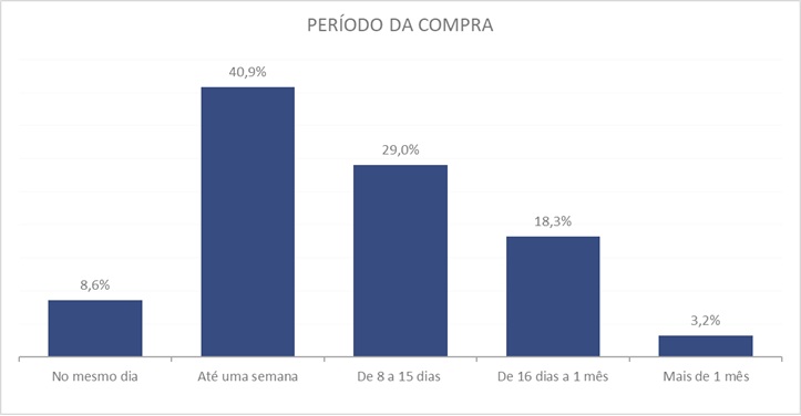 Quanto ao período das compras, 40,9% pretendem adquirir os presentes na semana que antecede o Natal. Outros 29% devem se organizar entre oito e quinze dias antes da data comemorativa, enquanto 18,3% se programam com até um mês de antecedência. Uma parcela de 12,9% afirma antecipar parte das compras durante a Black Friday.